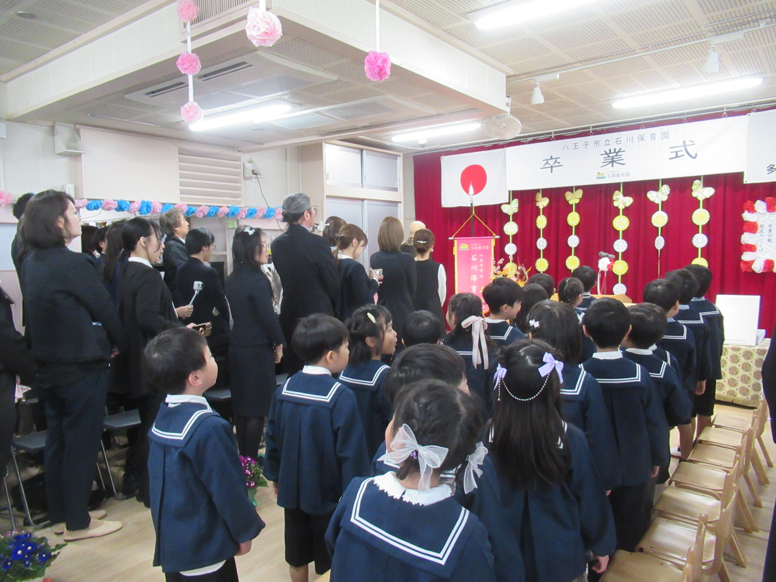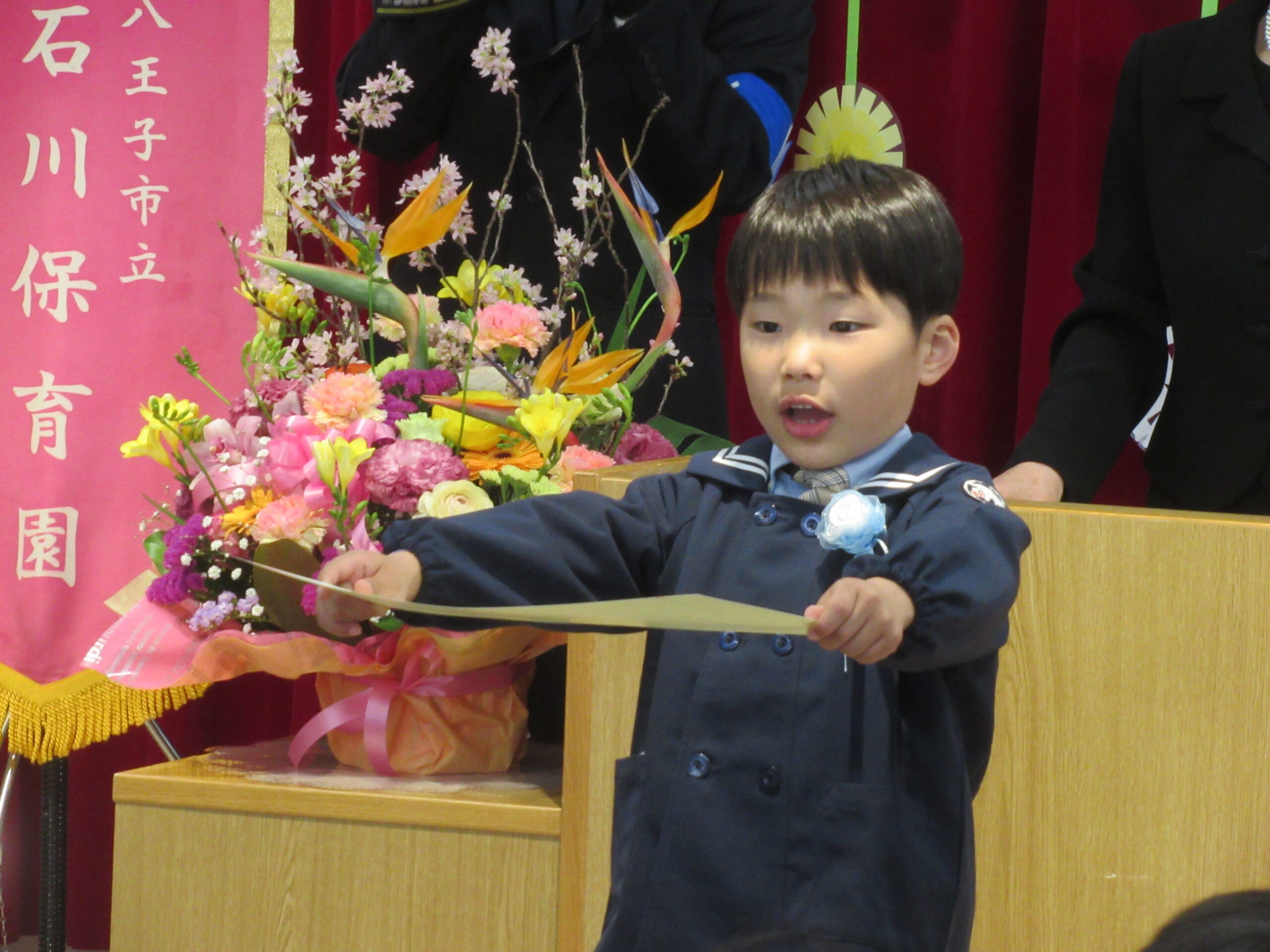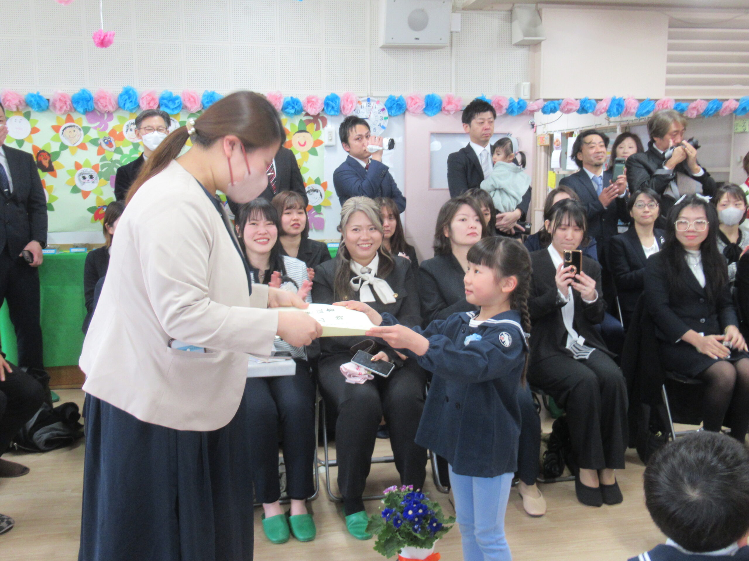 今日は卒業式がありました。入場前は友だちと着てきた洋服を見せあいながら、式が始まるのを待ち、入場すると保護者、在園児が温かい拍手で迎えてくれたことで、肩をすくめて恥ずかしそうにしてました。20人全員証書授与を受け取り、大きな声で小学生での目標を発表することができました。退場では、在園児が花のアーチを作り、その中を笑顔で通っていました。ご卒業おめでとうございます。