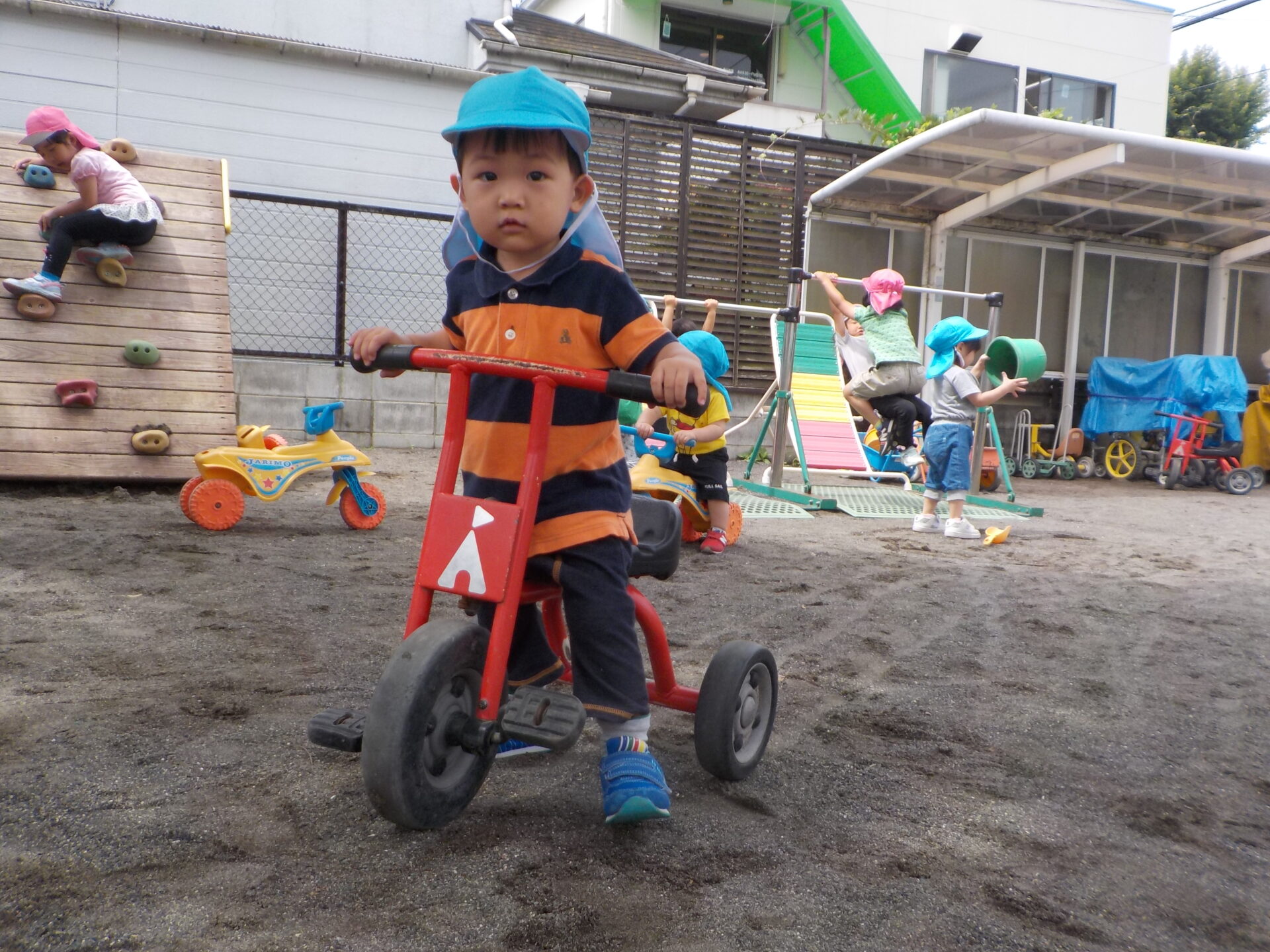 久し振りに雨が降っていなかったので、園庭で元気いっぱい遊んだ子ども達。手押し車の中に昨日の雨のあとを見つけては「水があったの。」「(砂を)入れてるんだよ。」と言って泥んこ遊びをやっていました。また、バイクや三輪車などの遊具が人気で、友だちと順番に乗って楽しんでいました。