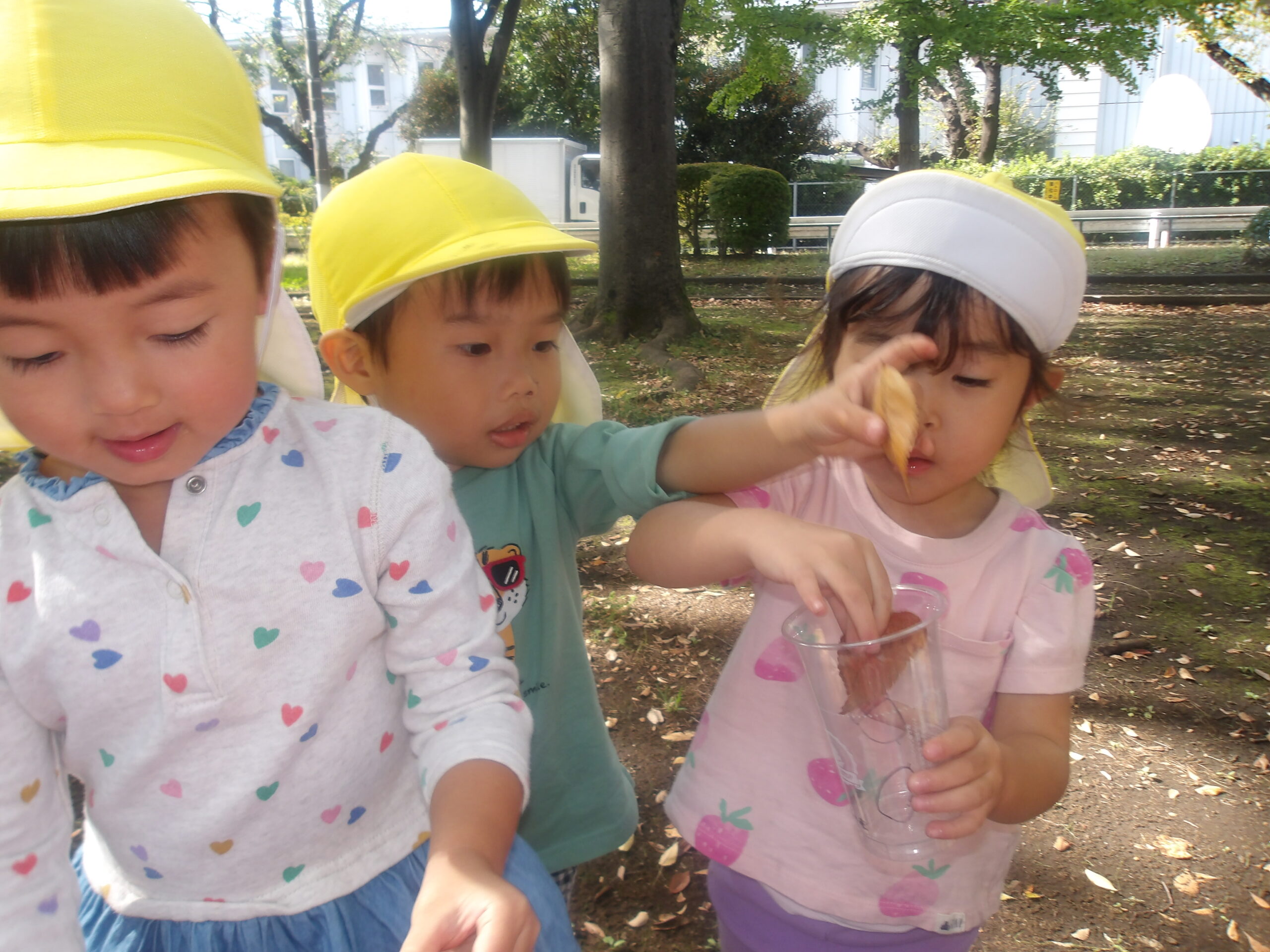 1、2歳児は高倉公園に行きました。公園でジュースとお煎餅を朝おやつで食べてエネルギーもりもり!公園内を散策して、落ち葉や木の枝等を見つけ、秋の自然に触れることができました。