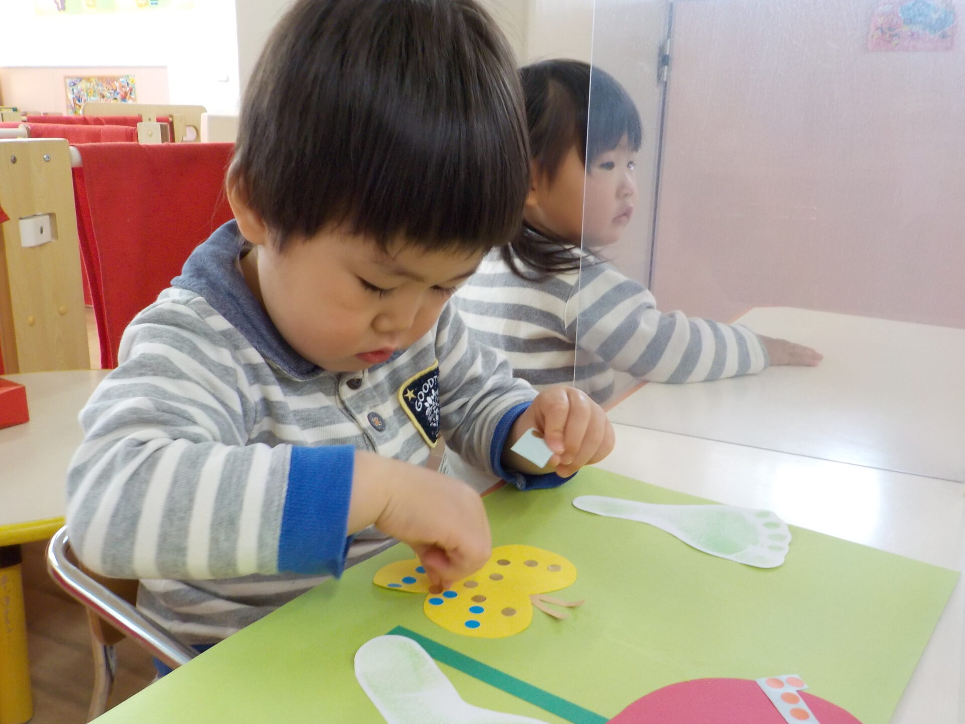 子ども達は画用紙を見て、「どこにはろっかな~。」「どうしよっかな~。」と考えながら、指先を上手に使ってぺたぺた貼っていました。出来 上がりを見て「上手に出来たでしょ!!」と満足そうに言っている姿がとても可愛かったです。