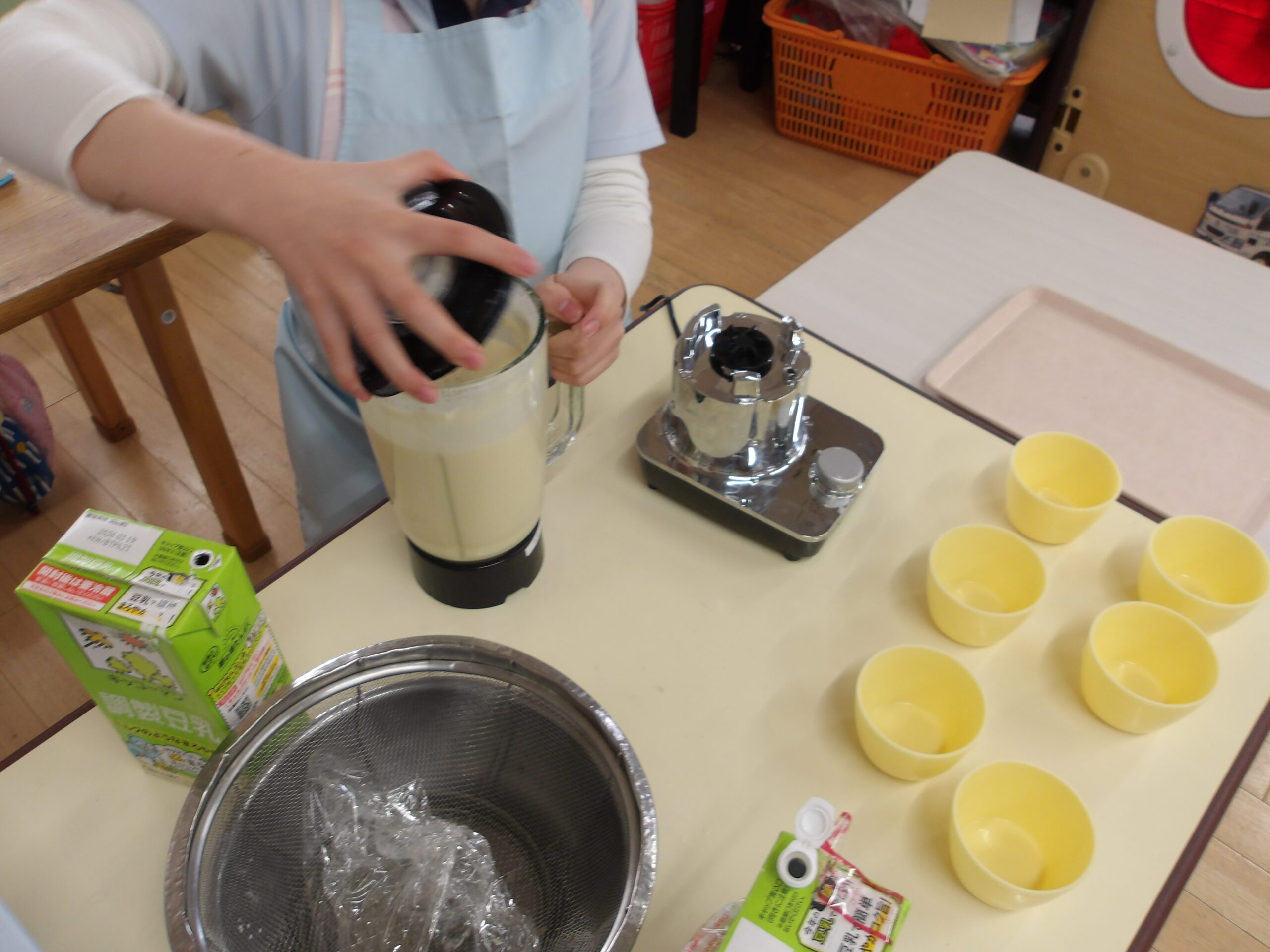 朝おやつの豆乳に桃缶を合わせてジュース作りを行いました。