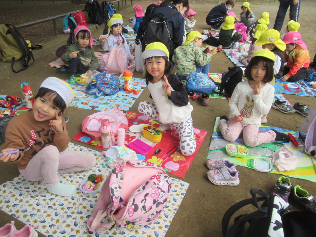 2~4歳児は近隣の公園に、5歳児は高尾山登山をしてお弁当を食べました。ご家庭の愛情たっぷり弁当にみんな笑顔でした。
