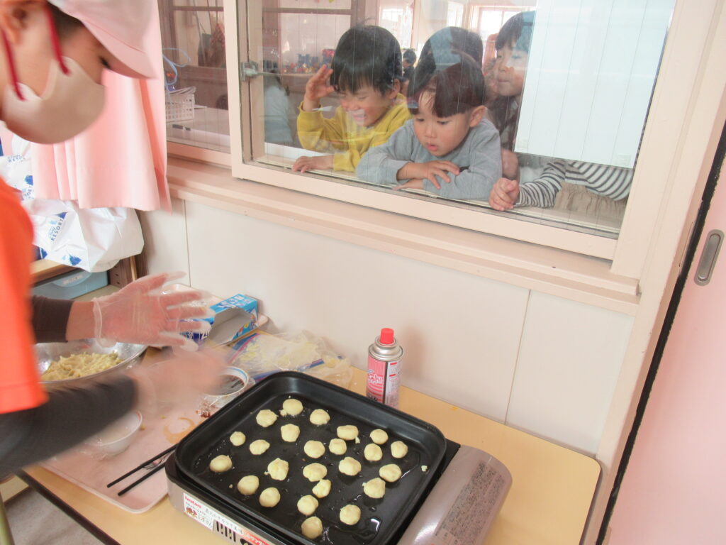 幼児組は収穫したさつま芋を使用していももちのライブキッチンを行い、給食で一緒に食べました。