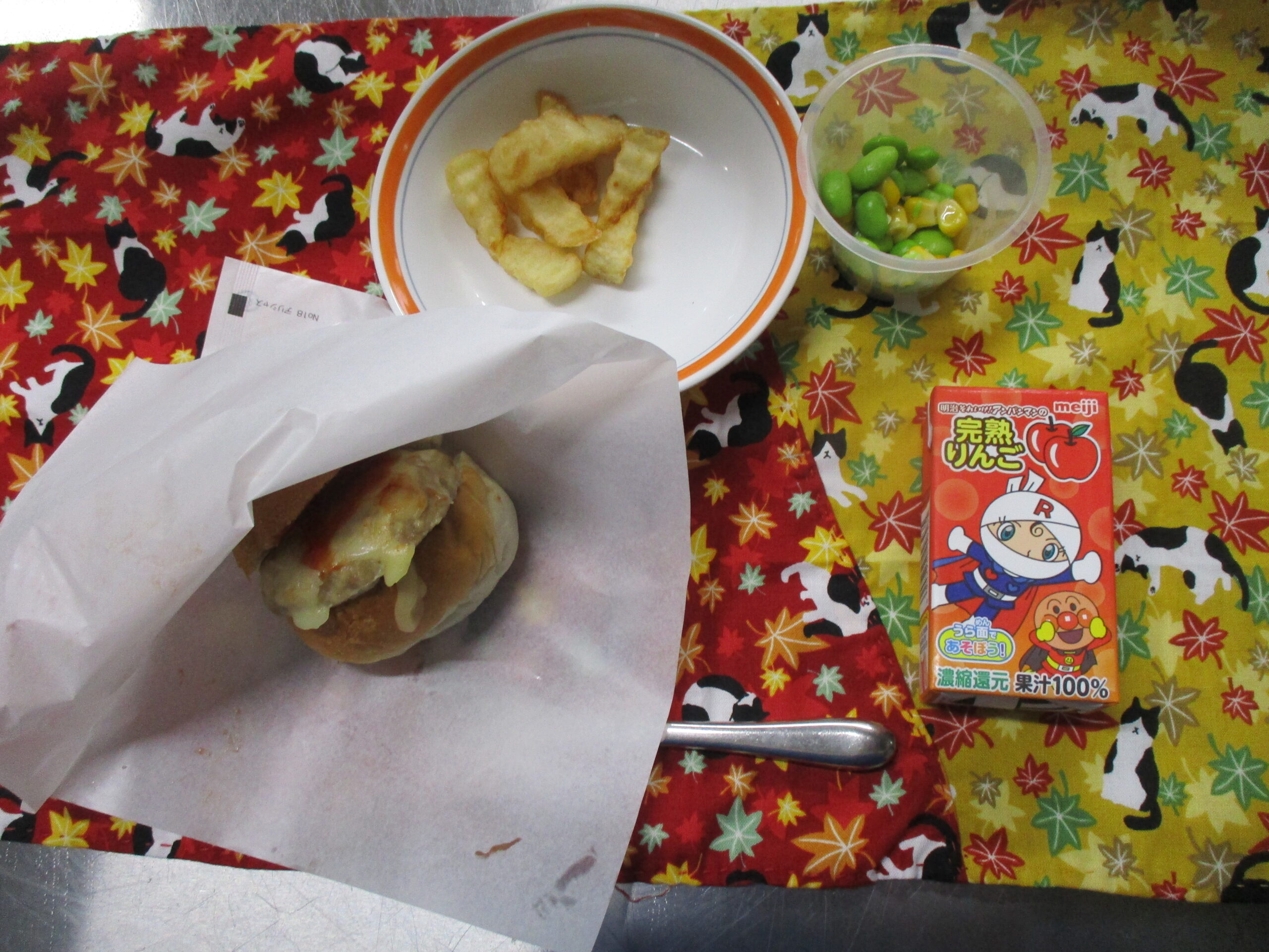 給食は、11月生まれの誕生日会で、某ハンバーガー屋さん風メニューを提供しました。