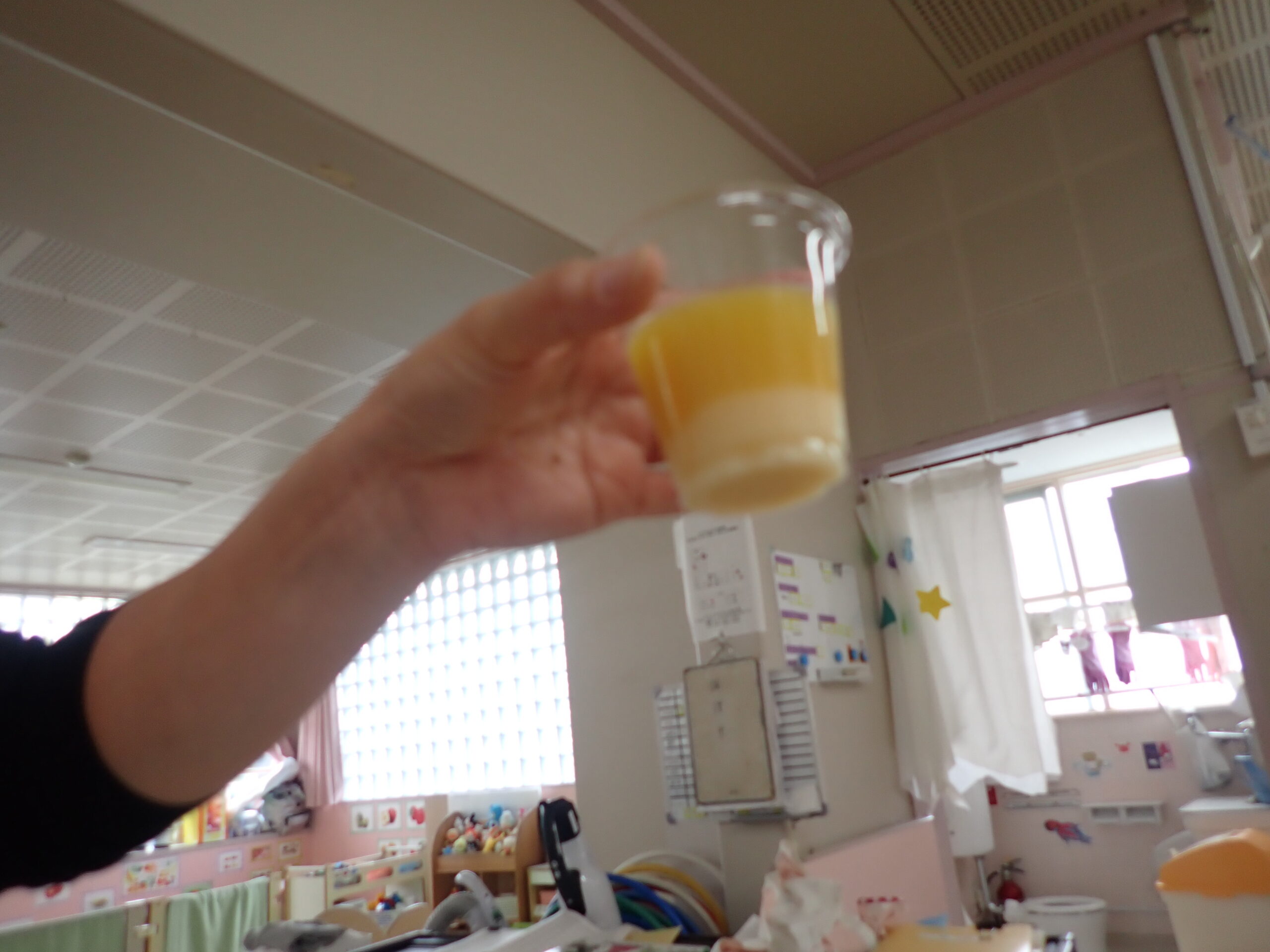 朝おやつの際に、オレンジジュースと桃缶を使ってミックスジュース作りをしました。事前に凍らせておいた桃缶をミキサーにかけてカップに注ぐと2層のミックスジュースになり、その様子をみて不思議を感じているようでした。