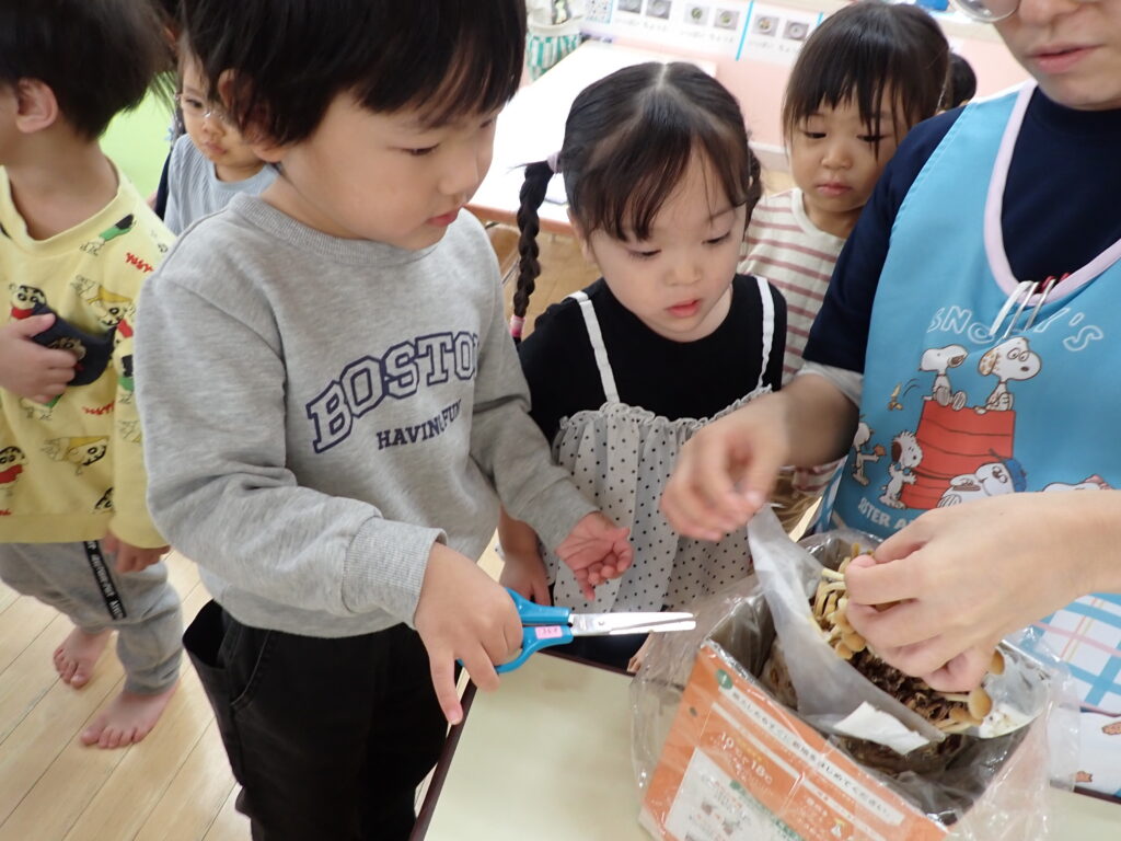 ほし組で栽培していたえのきを収穫し、お米研ぎをして、ベーコンと一緒に炊き込みご飯を作りました。